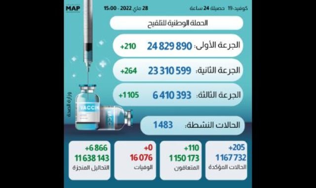 وأبرزت الوزارة، في النشرة اليومية لحصيلة (كوفيد-19)، أن 6 ملايين و410 آلاف و393 شخصا تلقوا الجرعة الثالثة من اللقاح المضاد للفيروس، فيما ارتفع عدد الملقحين بالجرعة الثانية إلى 23 مليونا و310 آلاف و599 شخصا، مقابل 24 مليونا و829 ألفا و890 شخصا تلقوا الجرعة الأولى.